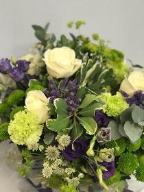 A delicate and fragrant mix of whites, purples, and lime green flowers with beautiful greenery to compliment.