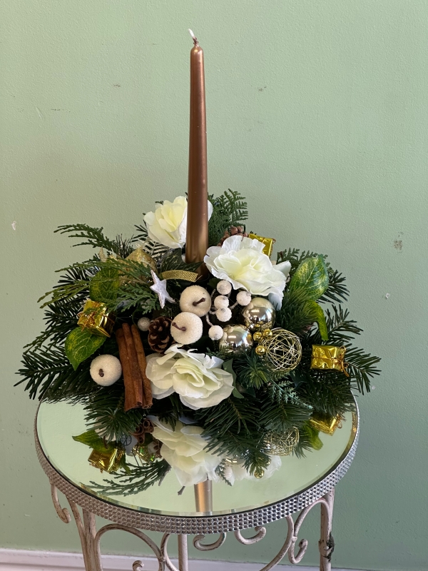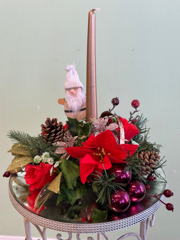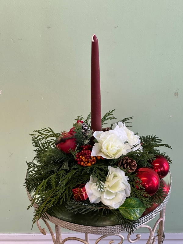 The perfect way to reflect on the past year with this enchanting, table arrangement on a mirror base made of fresh longer lasting greenery and silk flowers with a candle for that festive  glow.