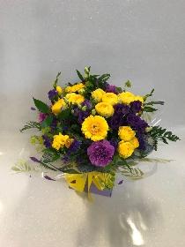 Shades of yellow Roses, Gerbera and Carnations mingle with purple Lizzianthus and Statice for a bold effect in this luscious aqua pack.